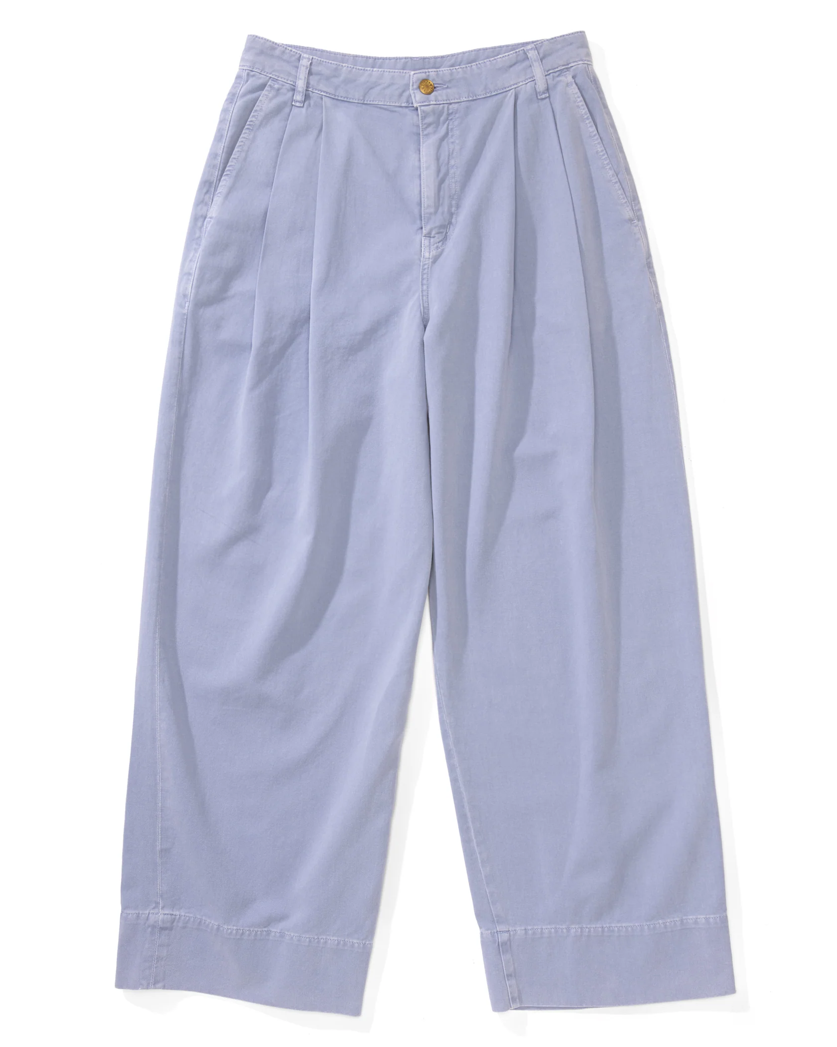 Exaggerated volume and sharp single pleats give the mid-high rise Martin Pleated Chino a relaxed la garçonne feel. They are made in American-milled cotton chino, then overdyed and stone washed classic sueded white. Full-length with a wide cuff, designed to sit on the shoe with a refined classic break.