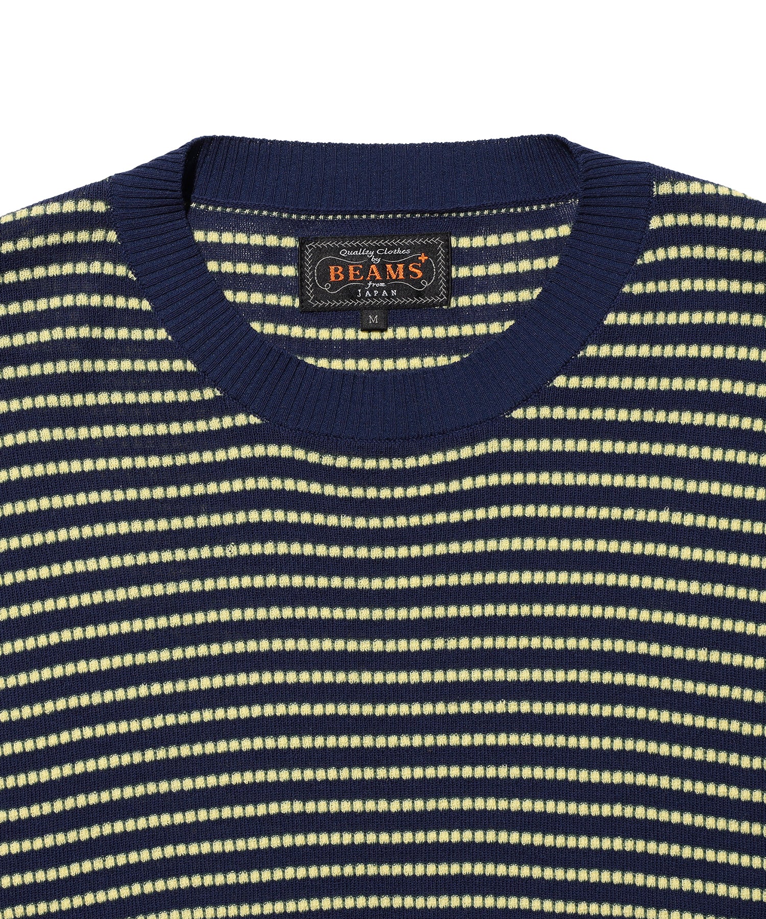 A short-sleeve knit with a dot pattern stripe finished with navy contrast ribbing. It has a breezy, relaxed fit designed to sit right at the hip making it perfect for spring and summer seasons.